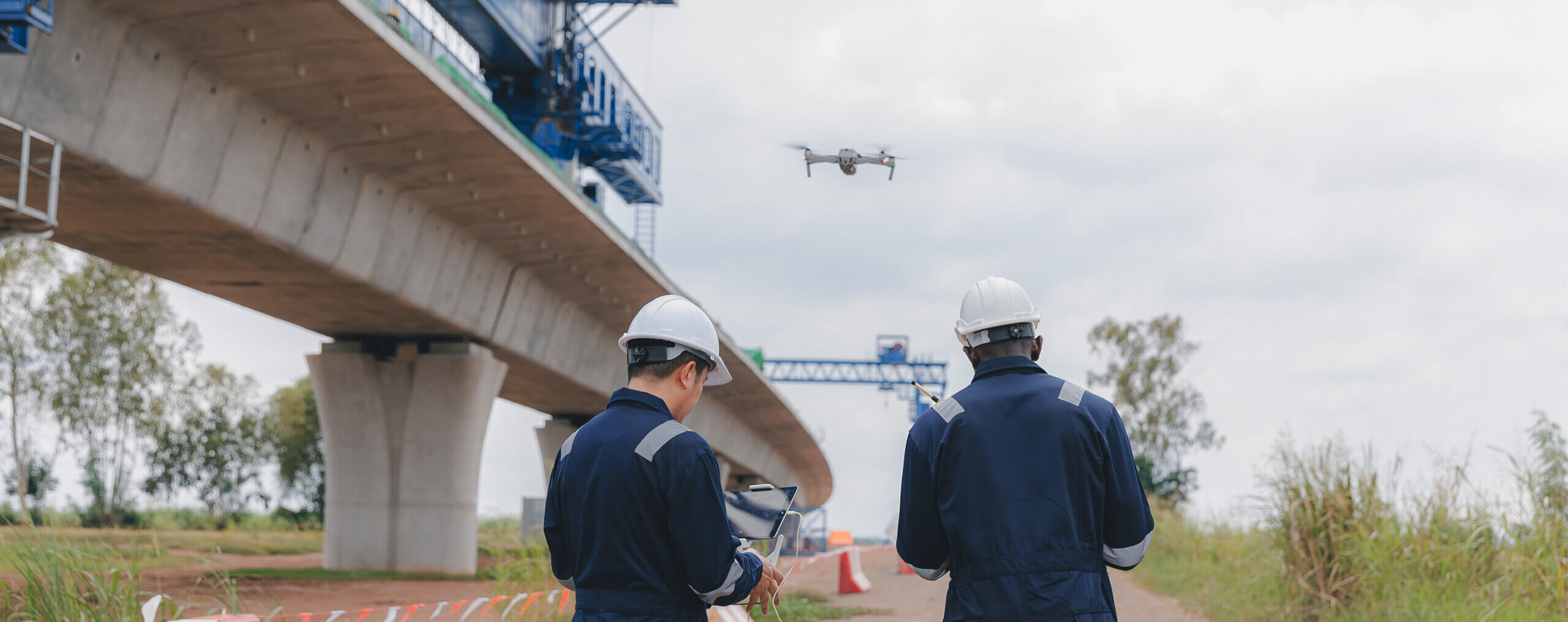 Engineer surveyor team Use drone for operator inspecting and survey construction site. Surveyors or explorer use drones to view construction sites or check security
